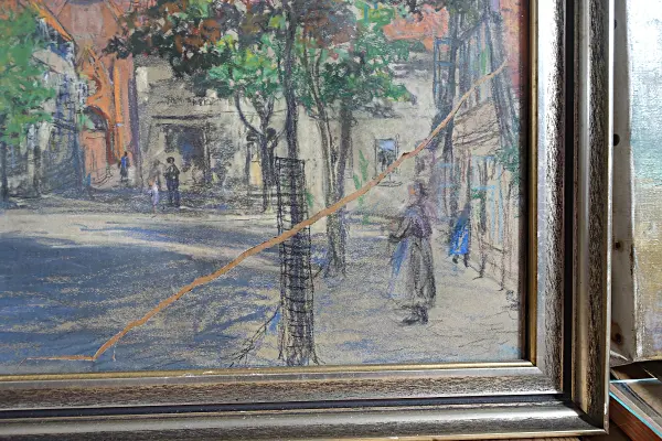 Ich denke, dass bei der Rahmung die Ränder des Bildes zu sehr fixiert worden sind. In der Folge kann die Beschädigung auch durch extreme Feuchtigkeitsschwankungen, oder auch eine mechanische Erschütterung entstanden sein.
